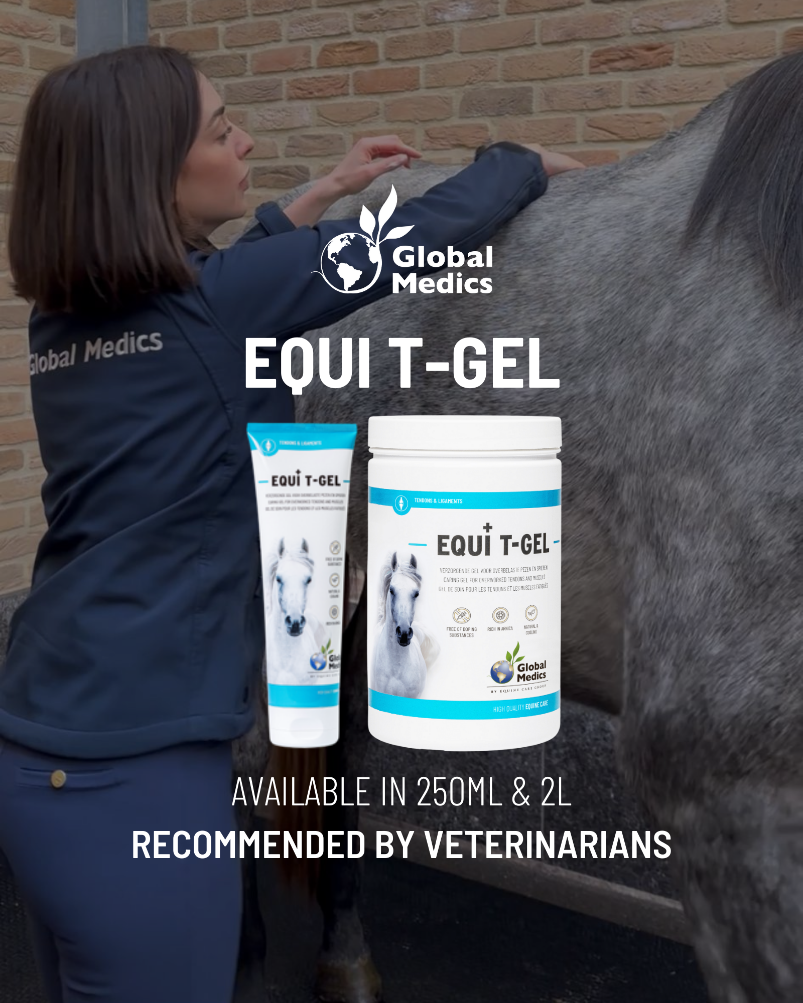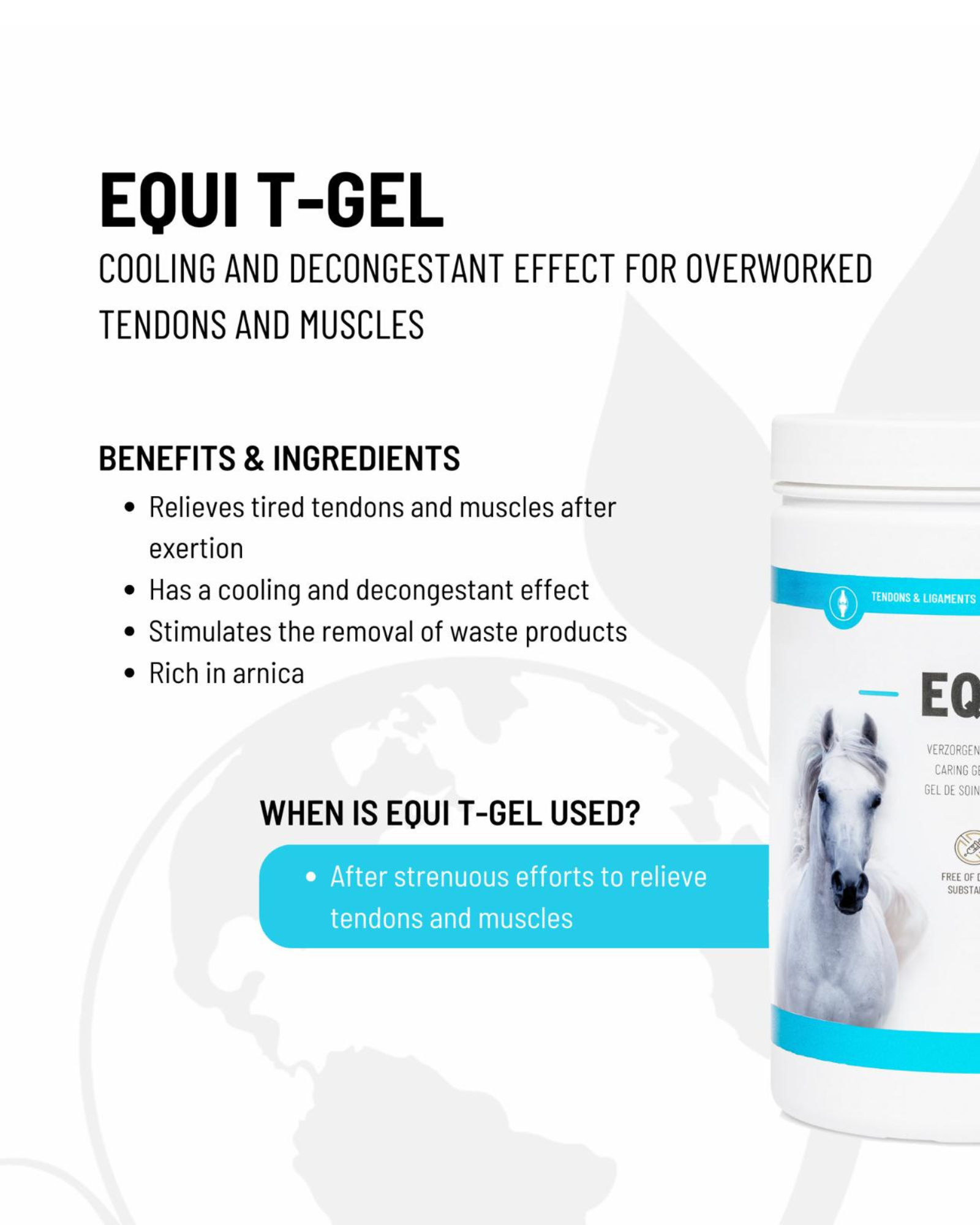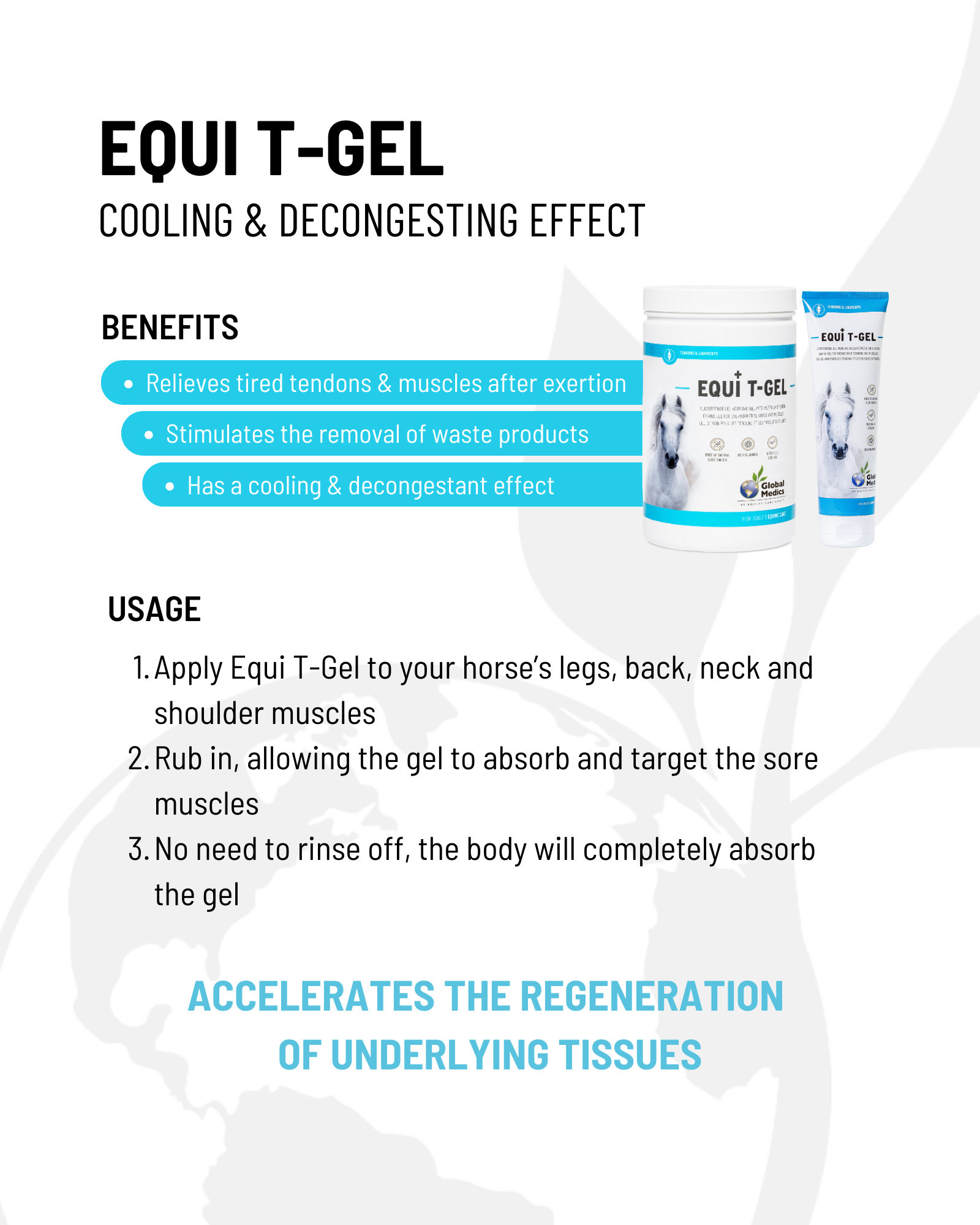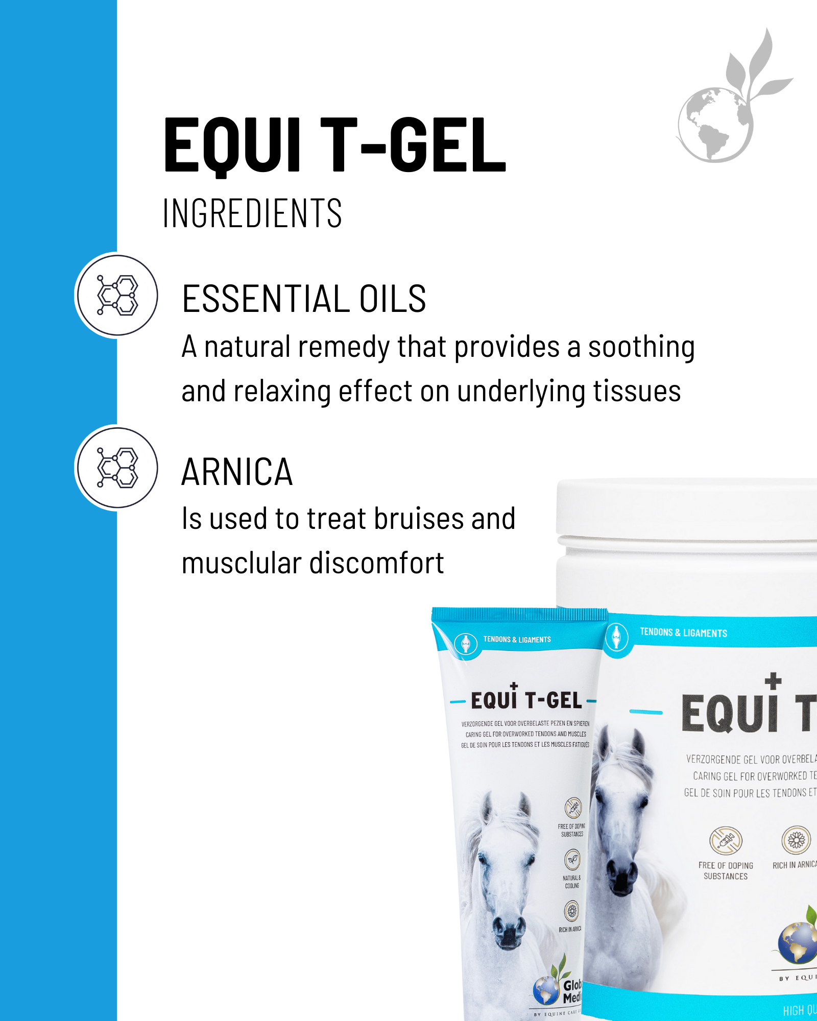 Global Medics Equi T-Gel based on arnica and highly oxygenated essential oils relieves tired tendons and muscles after exercise. This doping-free gel stimulates the drainage of waste products and contributes to the recovery of tissues as a result of overstraining. The gel has a cooling and decongesting effect on overworked muscles and tendons. This unique composition ensures that bruises and swellings are greatly reduced and accelerates the regeneration of underlying tissues. As a result, this product is very effective in relieving pain caused by heavy exertion.