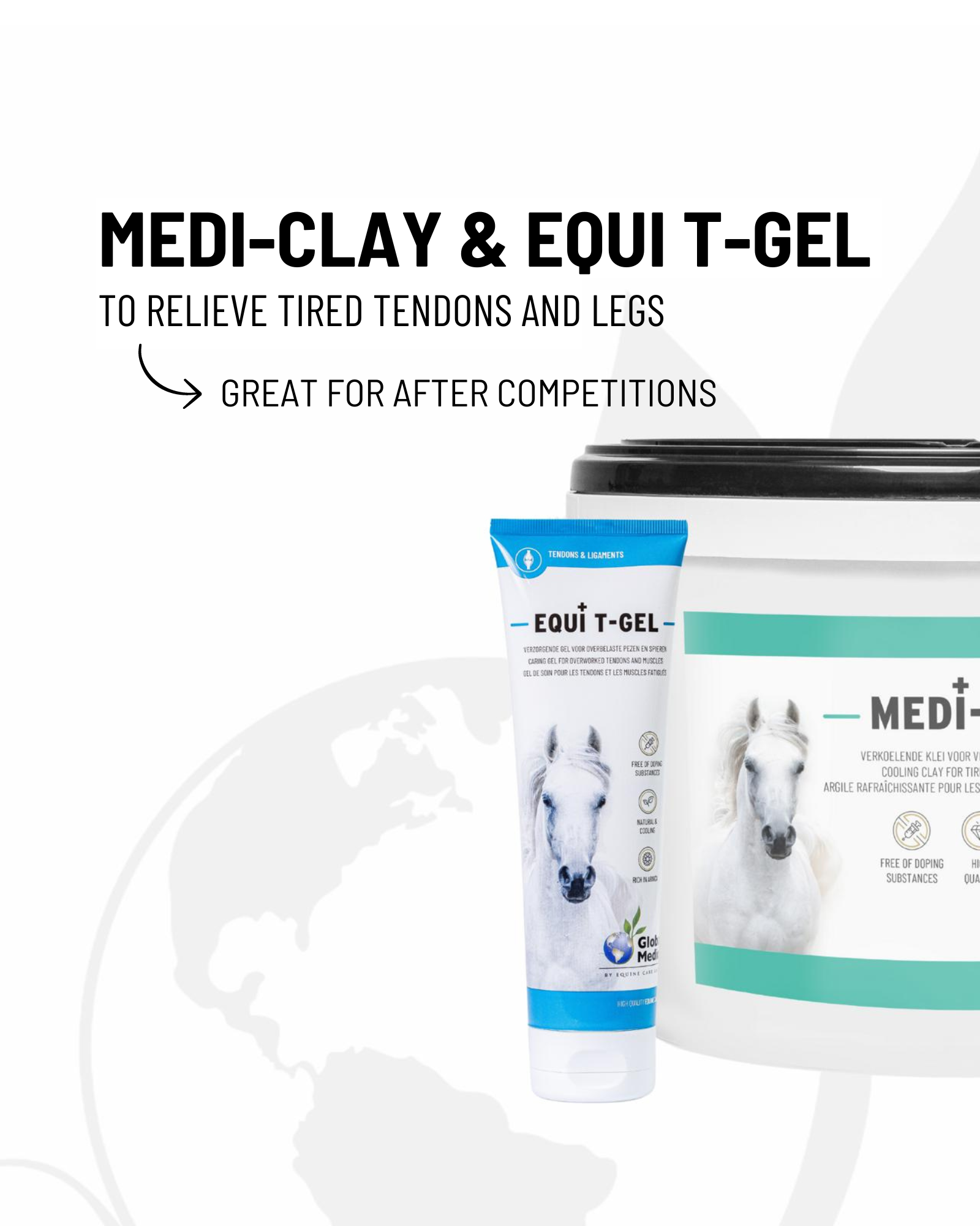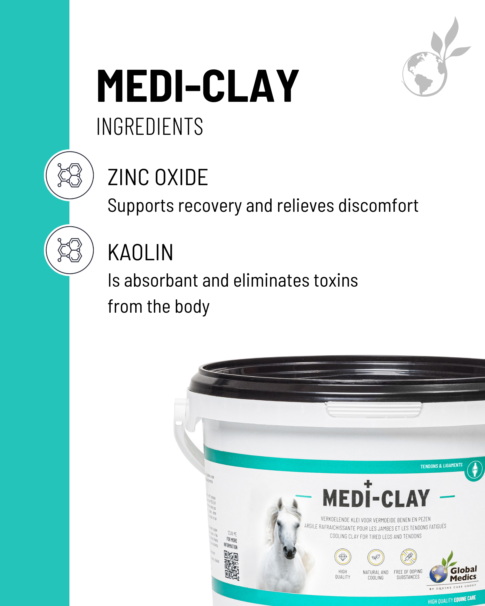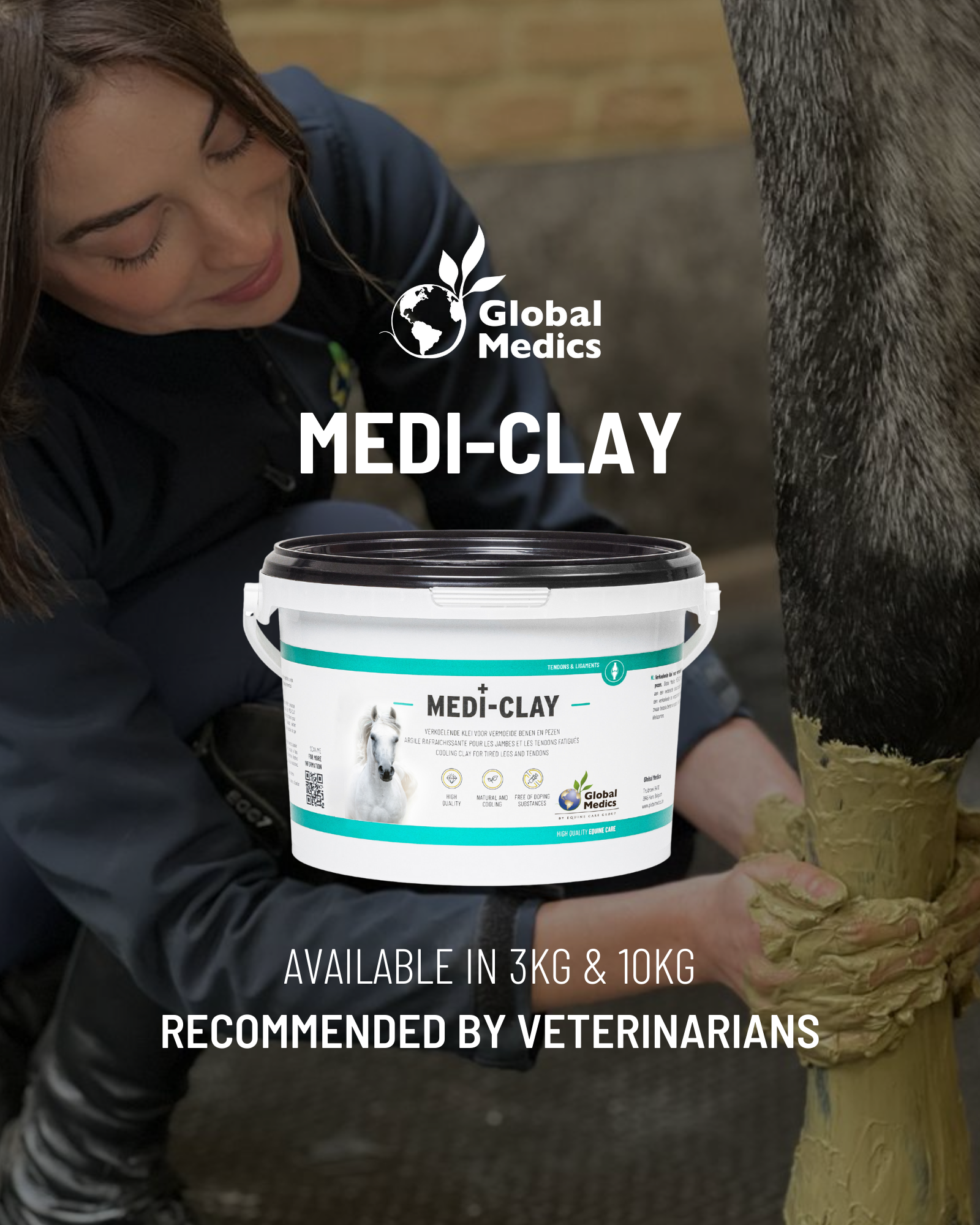Global Medics Medi Clay is a cooling clay used mainly on the lower legs of the horse. It contributes to an improved blood circulation and has a cooling and soothing effect on heavily loaded legs and tendons. Medi Clay can be used with horses in rehabilitation after an injury or with horses that are making heavy physical efforts. As a result of heavy training or competition, the horse's legs may feel slightly swollen and/or tired the day after. The use of Medi Clay ensures that the horse's legs dry out nicely and that waste products are removed. The clay has a long-lasting cooling effect and reduces swelling by its soothing effect on inflammatory reactions in the body.