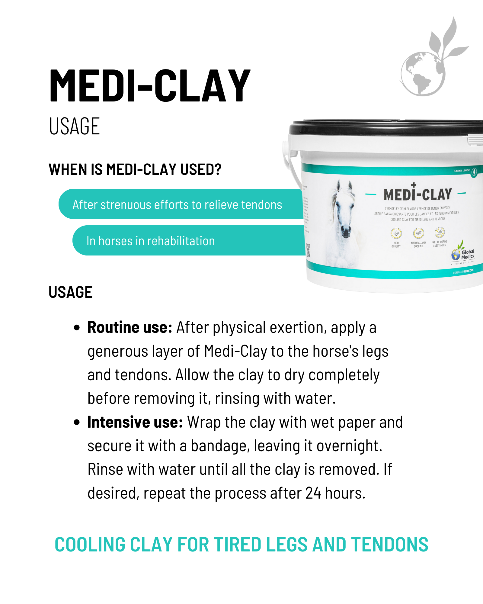 Routine use: After heavy physical exertion, apply a generous layer of Medi Clay to the horse's legs and tendons to provide rapid cooling. Allow to dry completely and rinse with water until all clay is removed.