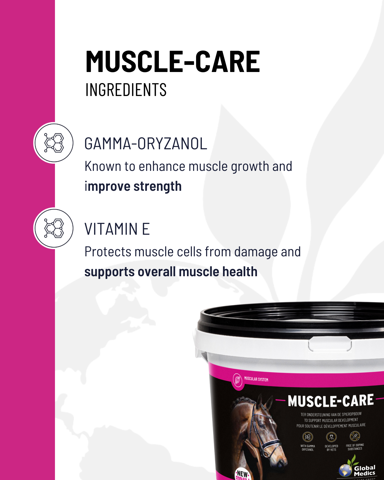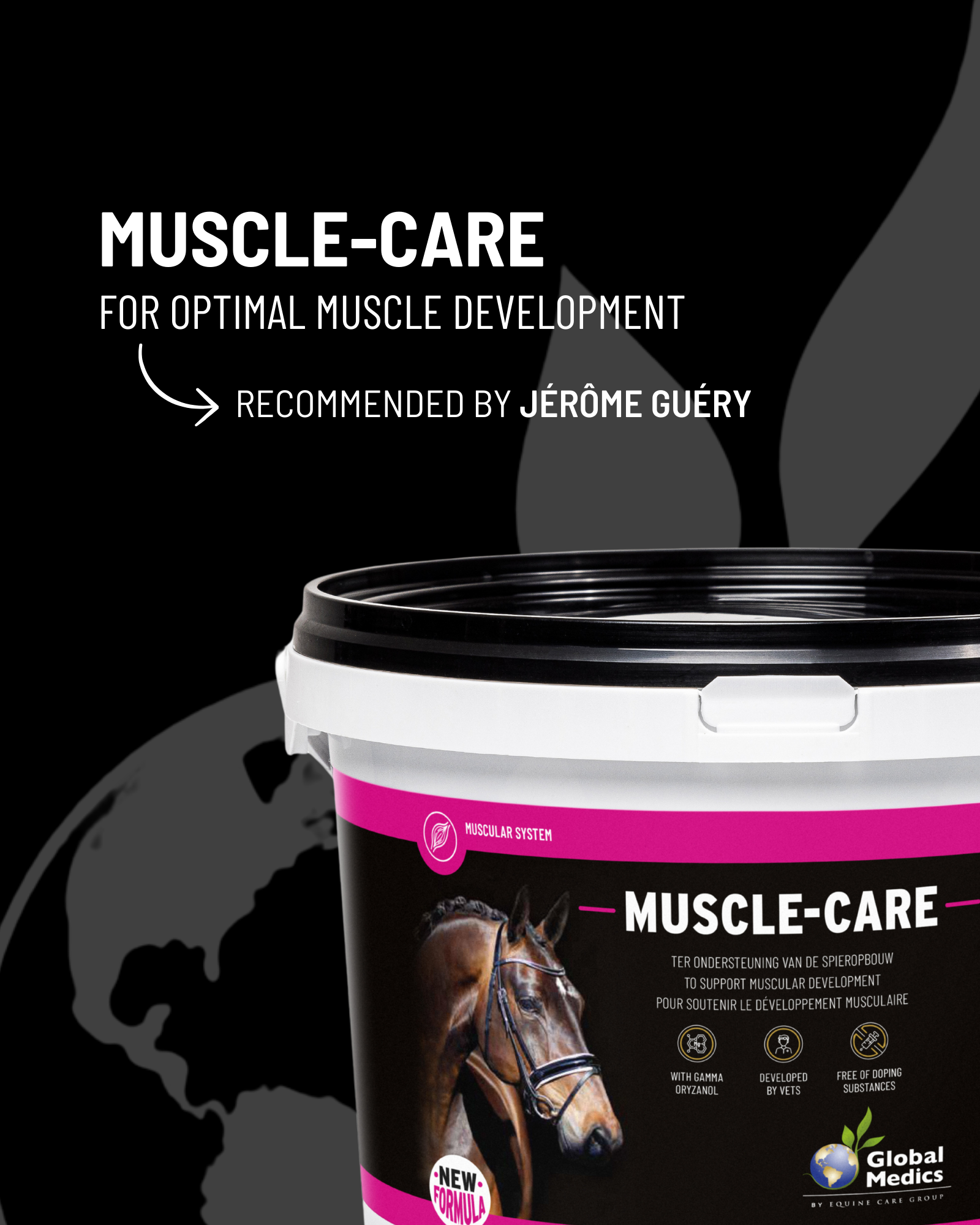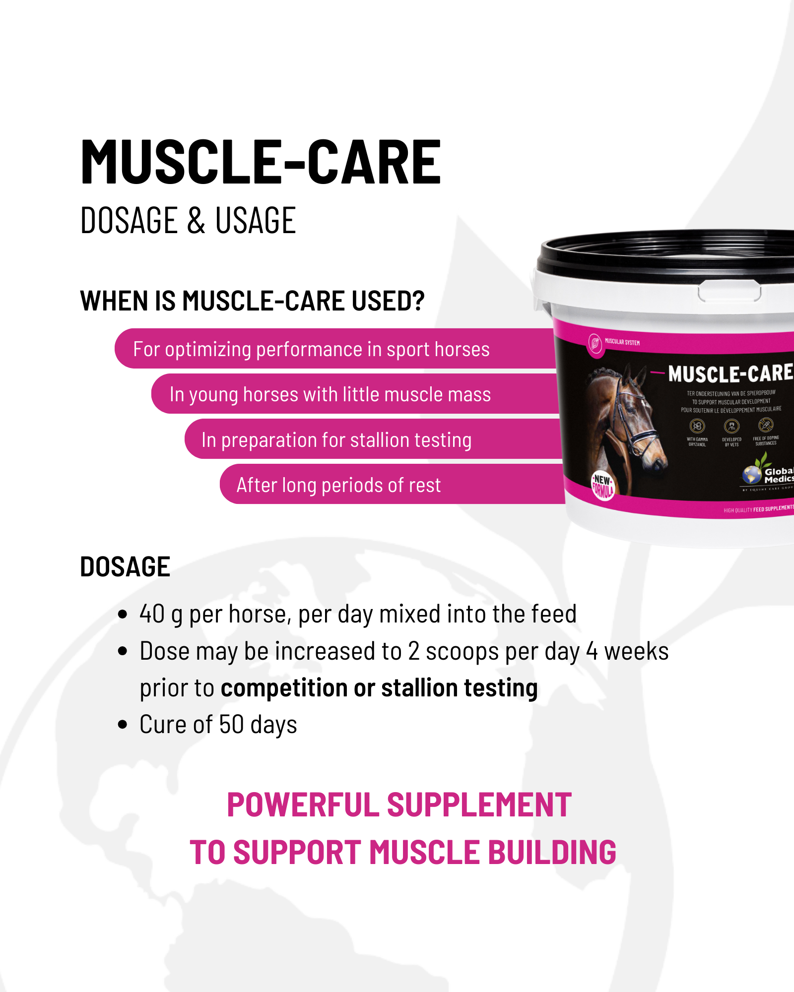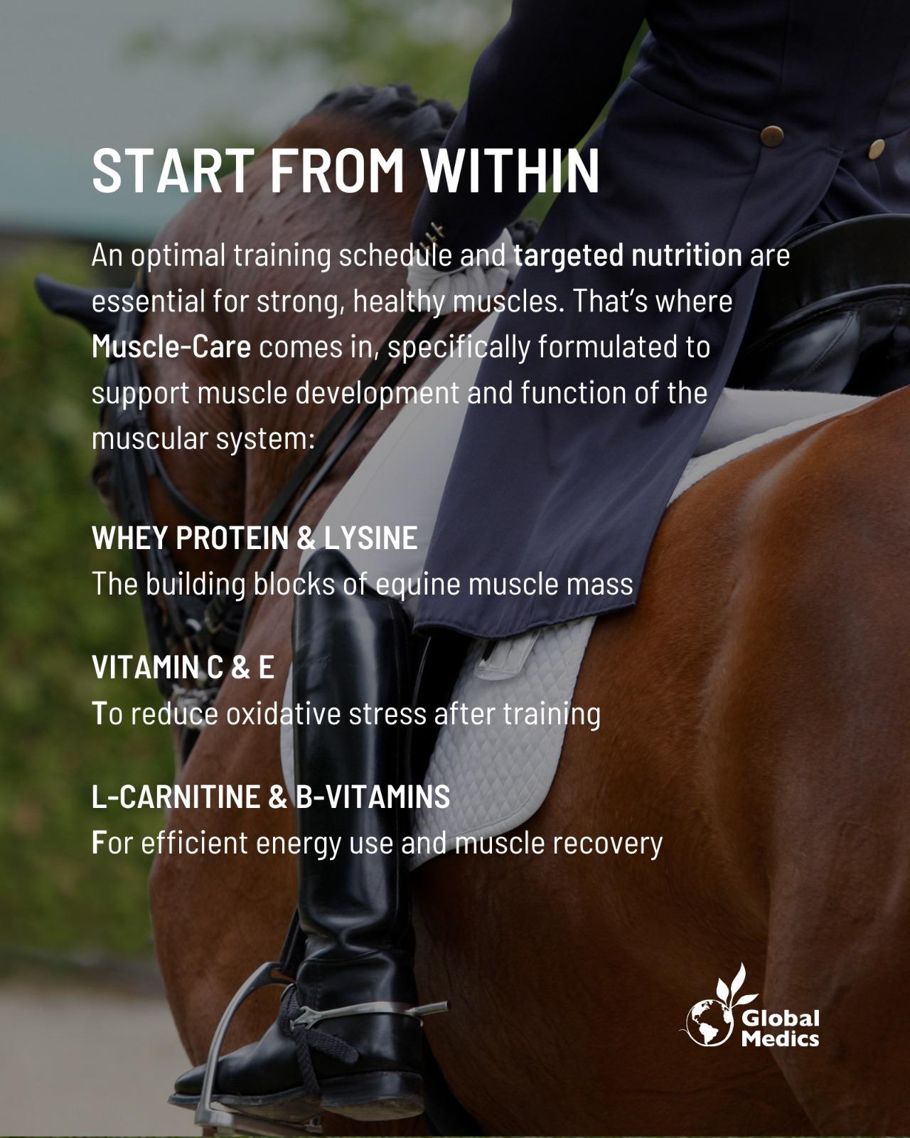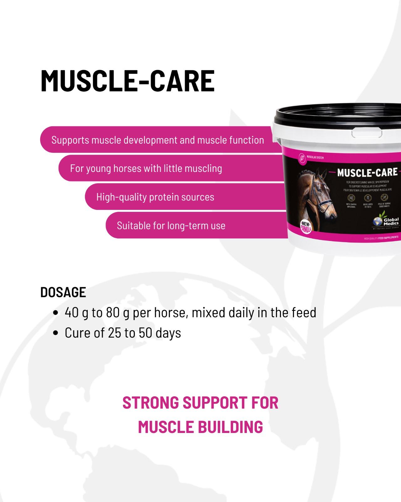 Muscle-Care est souvent utilisé pour remettre d’aplomb les chevaux maigres, pour préparer les étalons à l’homologation et pour renforcer les chevaux présentant la moindre résistance.