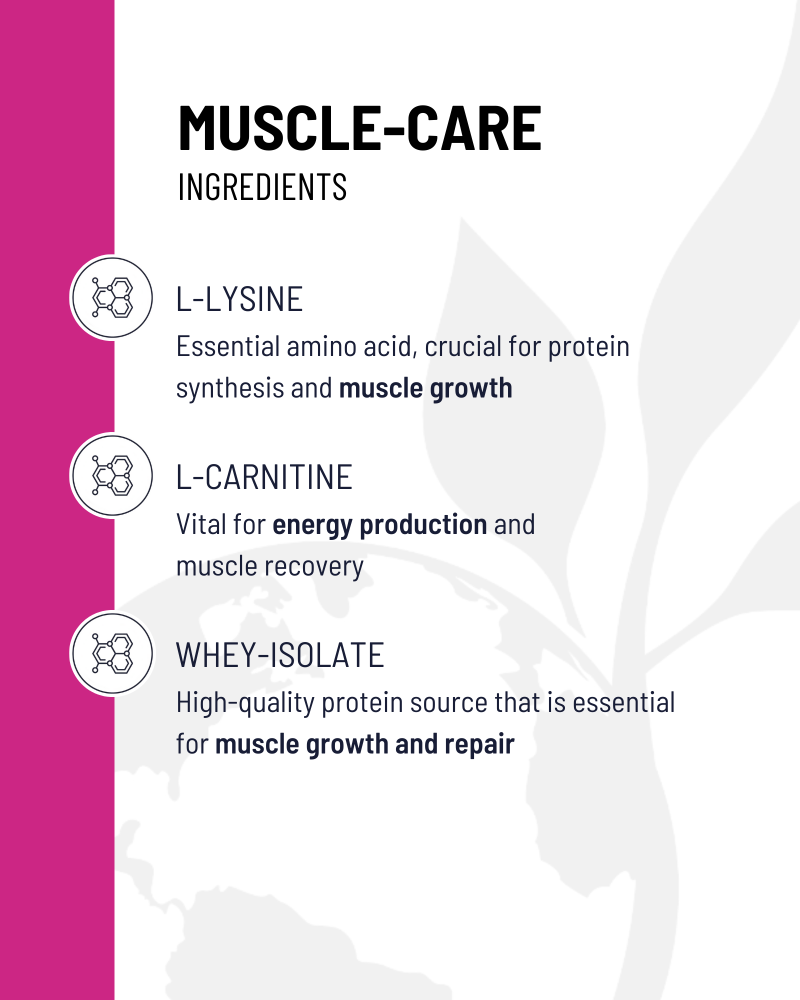 Muscle-Care est recommandé pour le soutien maximal des muscles dans les prestations de haut niveau. Il contient tous les nutriments nécessaires pour soutenir les muscles, ainsi que les composants essentiels destinés à la transformation de l’AMP en ATP qui assure l’alimentation énergétique des cellules pendant les concours.