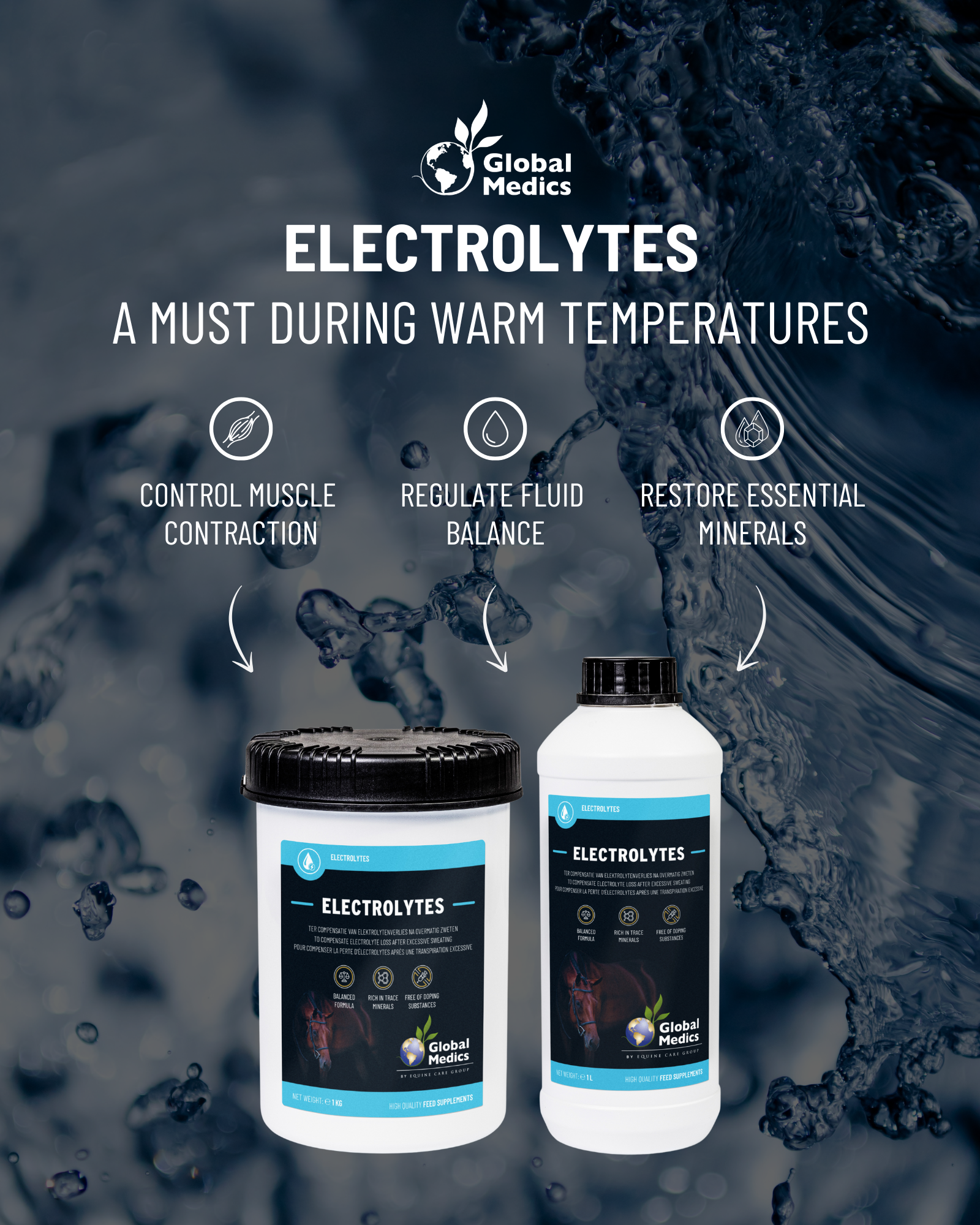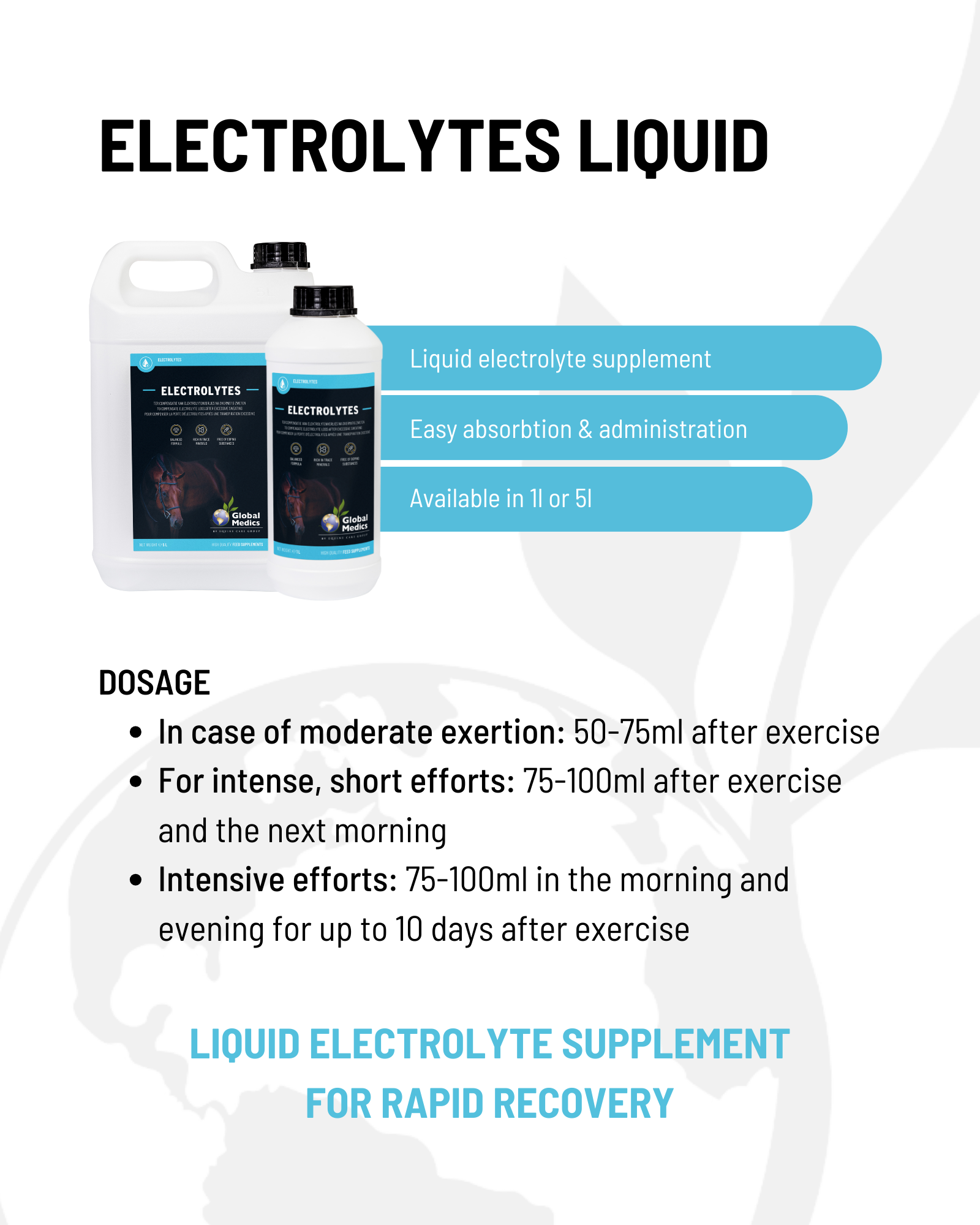 Tijdens inspanningen verliezen paarden grote hoeveelheden aan vocht en elektrolyten via het zweet. Deze elektrolyten zijn echter essentieel voor een goede werking van de spieren en het zenuwstelsel. Een tekort een electrolytes kan leiden tot prestatieverlies, vermoeidheid en verlies in kracht en uithouding. In ergere gevallen kunnen dehydratatie en een tekort aan deze essentiële zouten aanleiding geven tot spierkrampen en uitdroging. Let op, stresstoestanden en hoge temperaturen kunnen ook een ernstige verstoring van de zout/vochtbalans teweegbrengen zonder dat de paarden inspanningen leveren. Electrolytes is een uitermate compleet elektrolyten supplement in poedervorm voor paarden dat zorgt voor een snelle recuperatie. Natriumchloride en kaliumchloride herstellen het verlies van vocht en essentiële mineralen. Vitamine E is een antioxidant dat een positieve invloed heeft op de weerstand en ondersteunt een optimale spierfunctie en de werking van het zenuwstelsel. Tip: Zorg steeds dat paarden voldoende zuiver drinkwater ter beschikking hebben voor een optimaal effect van de elektrolyten te bekomen.