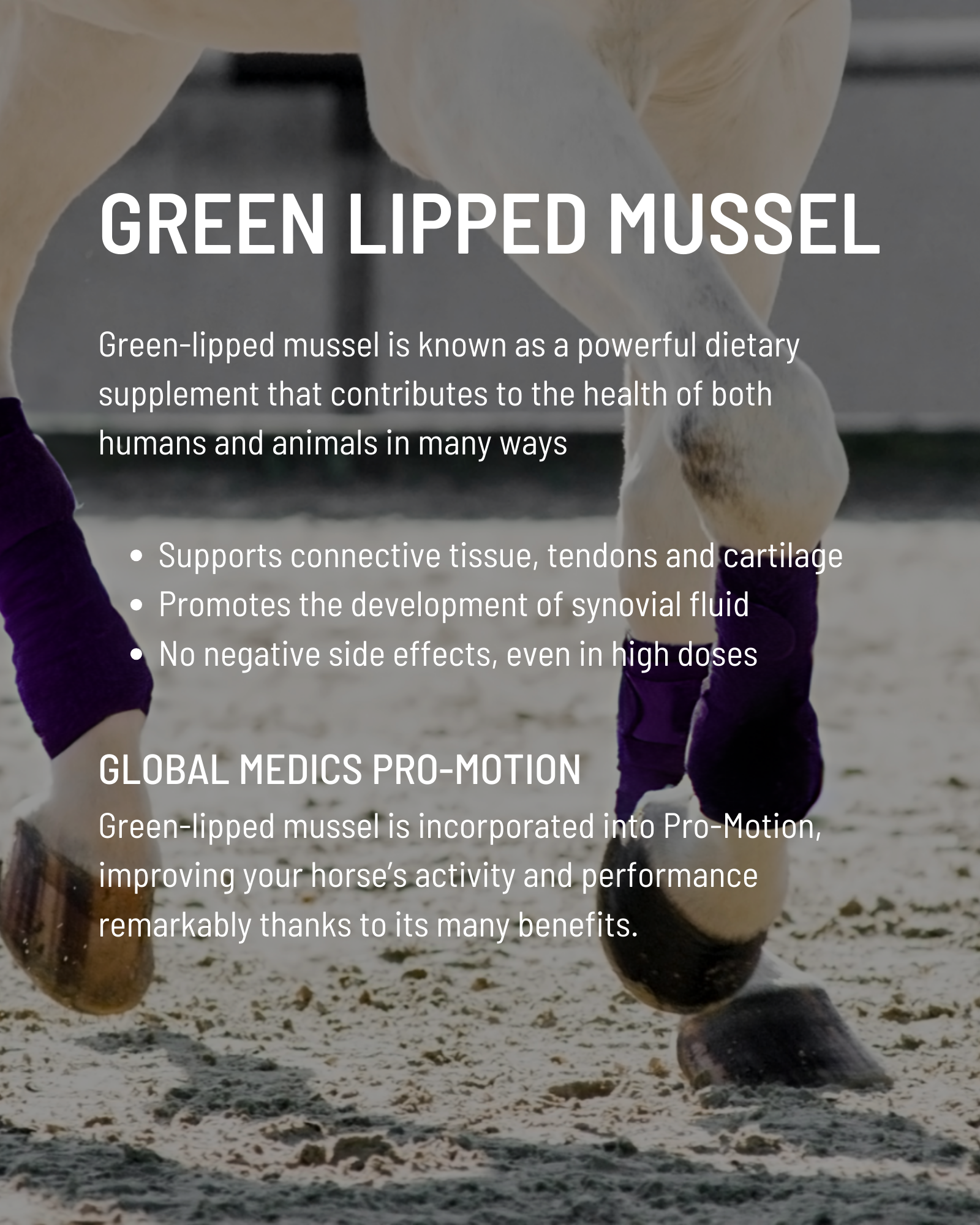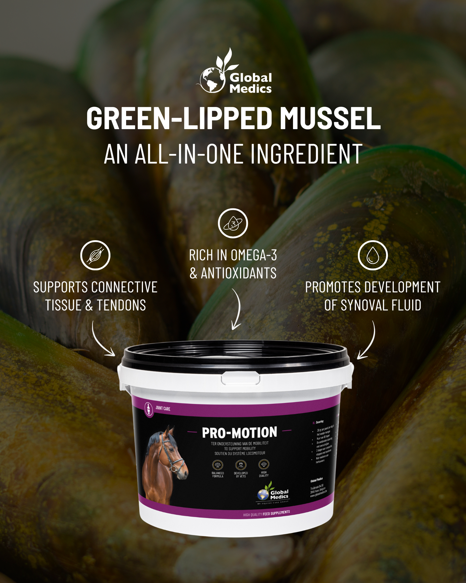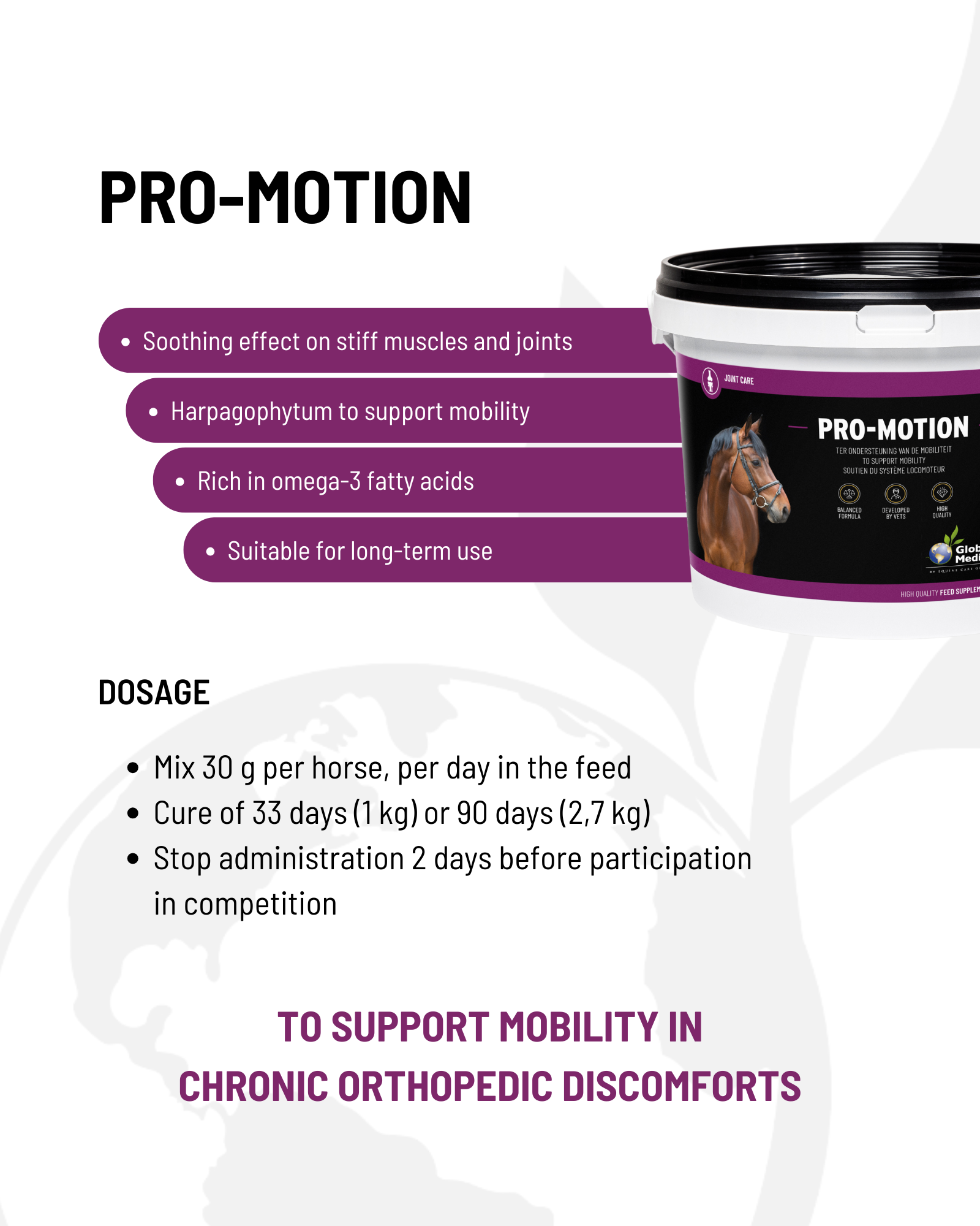 Veel paarden worden in de loop van hun sportieve carrière geconfronteerd met chronische orthopedische ongemakken. Pro-Motion werd op een dusdanige manier samengesteld om het volledige bewegingsstelsel bij deze paarden te ondersteunen.